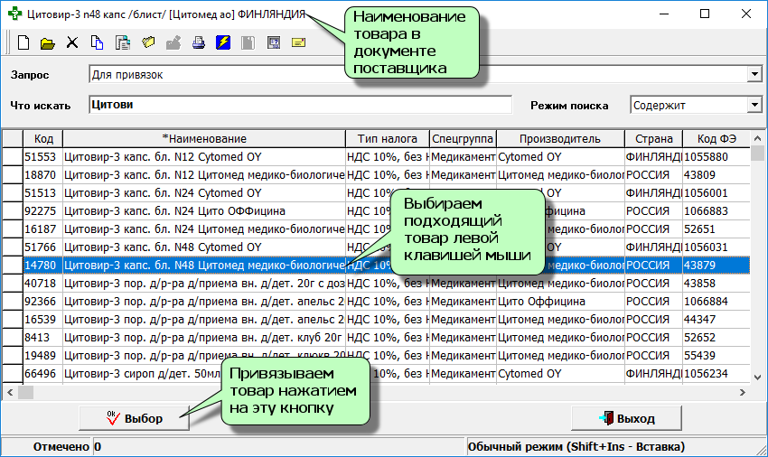 Справочник товаров закроется, и пользователь будет возвращён в окно Импорт документов (новый), при этом поля Код и Наименование выбранного товара будут привязаны.
