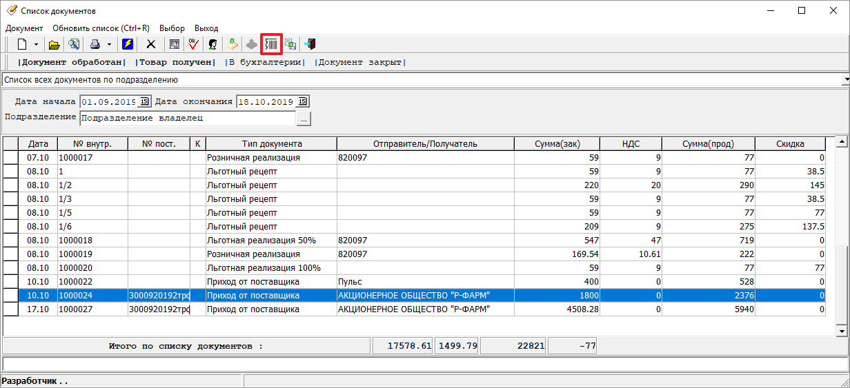 - строки с расхождениями кол-во/МДЛП – отображает строки, в которых количество товаров по документу не сходится с количеством товаров, по которым было получено подтверждение из МДЛП.