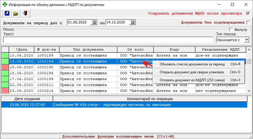 - Обновить список документов за период - позволяет обновить список отправленных в МДЛП документов за выбранный период. Также можно воспользоваться сочетанием «горячих клавиш» Ctrl+R.
