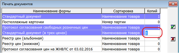 Имеется возможность изменить количество копий для выделенного шаблона, если выбрать поле Копий и ввести новое значение. Также можно выбрать по одной копии сразу всех печатных форм с помощью кнопки