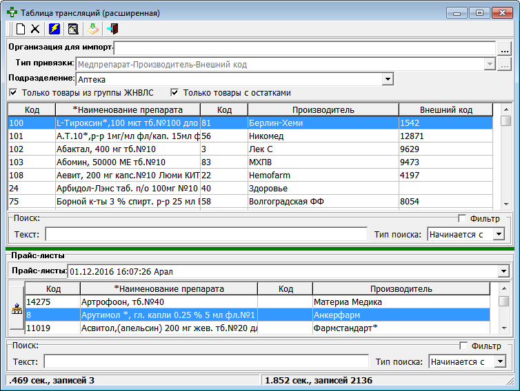 Расширенная таблица трансляции в основном предназначена для связывания записей Справочника товаров с фиктивными прайс-листами Росздравнадзора при контроле над ценами ЖНВЛС. Однако Расширенная таблица трансляции может быть использована и в других целях (там, где товары идентифицируются по комбинации наименование + производитель).