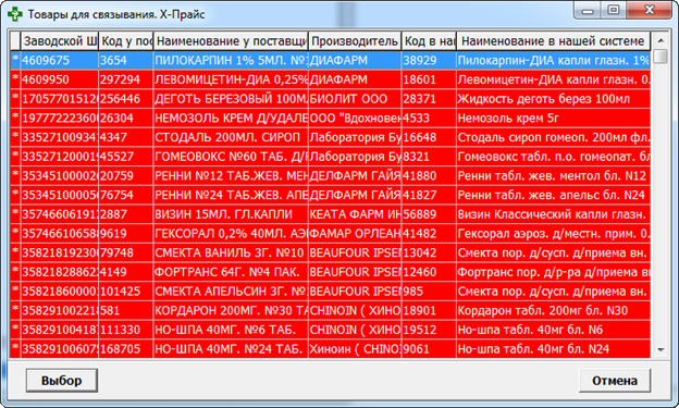 По умолчанию уже на всех позициях списка установлена отметка для связывания. Если нажать кнопку Выбор, будет произведено автоматическое связывание кодов товаров.