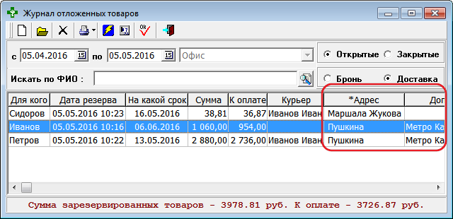 Рекомендуется для клиента вводить Доп. информацию в формате, удобном для ориентирования, например, указывать район доставки. Это позволит в Журнале отложенных товаров сортировать заказы по району доставки для планирования работы курьера и отчётности. Для сортировки следует щёлкнуть левой клавишей мыши по названию соответствующей колонки.